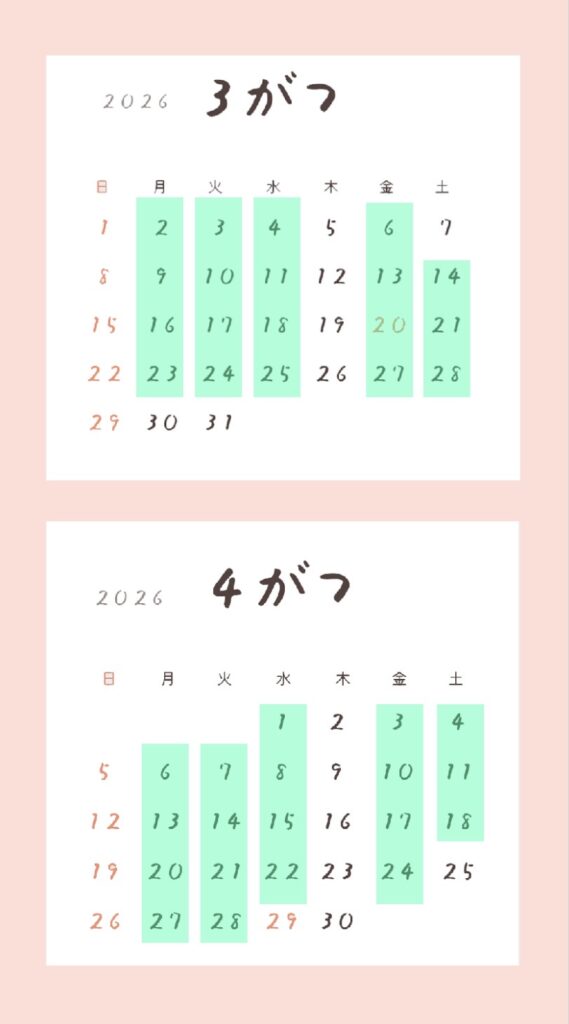 色のついているところが開室日です。木曜、日曜はお休みです。