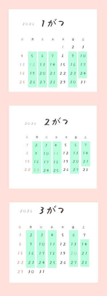 色のついているところが開室日です。木曜、日曜はお休みです。